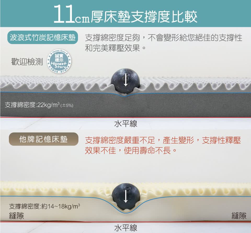 【材質】3cm一體成型波浪式記憶綿密度35kg/m3(5%) +8cm支撐綿密度22kg/m3(5%)
