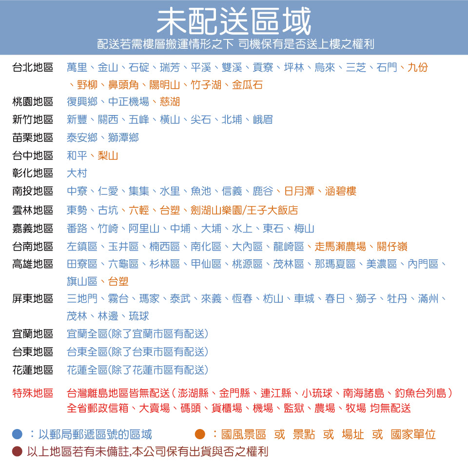 1.限台灣本島(偏遠山區恕無法配送,如欲知詳細區域,請來電客服詢問,不便之處,敬請見諒!)